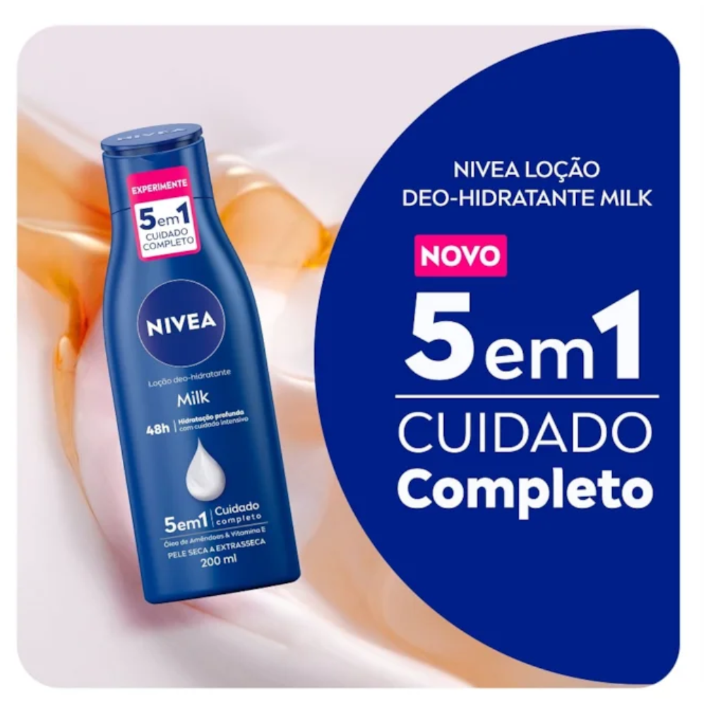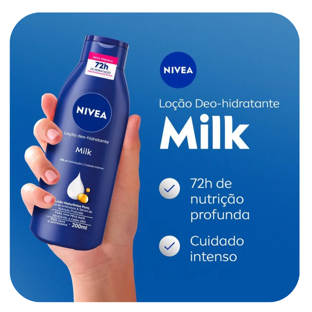 O NIVEA Milk 200ml é um hidratante corporal desenvolvido especialmente para pele seca e extrasseca, garantindo hidratação profunda, nutrição intensa e toque macio por longos períodos. Sua fórmula rica combina óleo de amêndoas, ácido hialurônico e sérum nutritivo, oferecendo cuidado diário eficaz com absorção rápida e textura não oleosa.