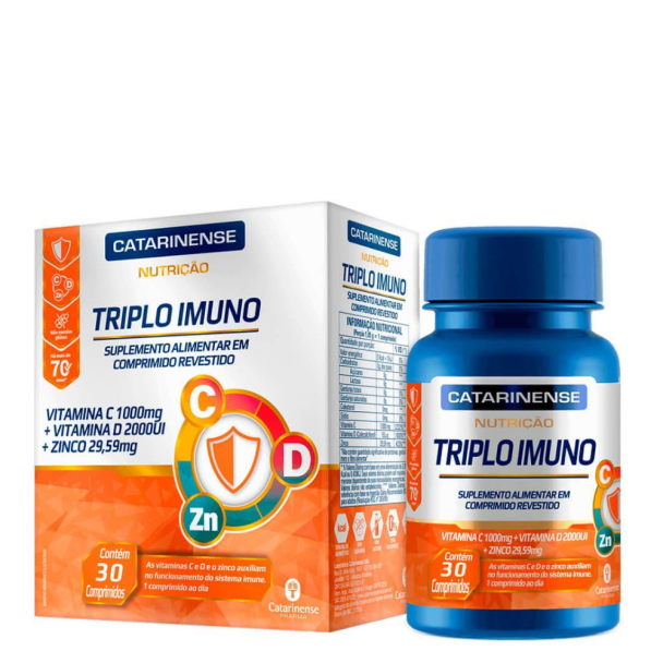 Triplo Imuno foi desenvolvido com base nas necessidades nutricionais específicas para indivíduos com 19 anos ou mais. Possui em sua formulação 3 nutrientes (2 vitaminas + 1 mineral): Vitamina C 1.000 mg + Vitamina D 2.000 UI + Zinco 29,59 mg.